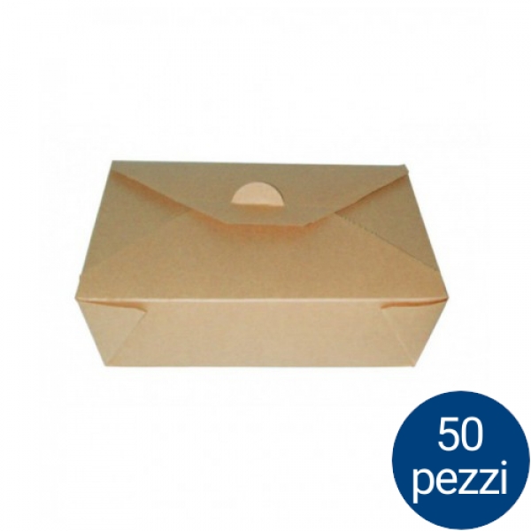 Scatola in cartone kraft laminato antiunto resistente. Idoneo al contatto con alimenti sia caldi che freddi.