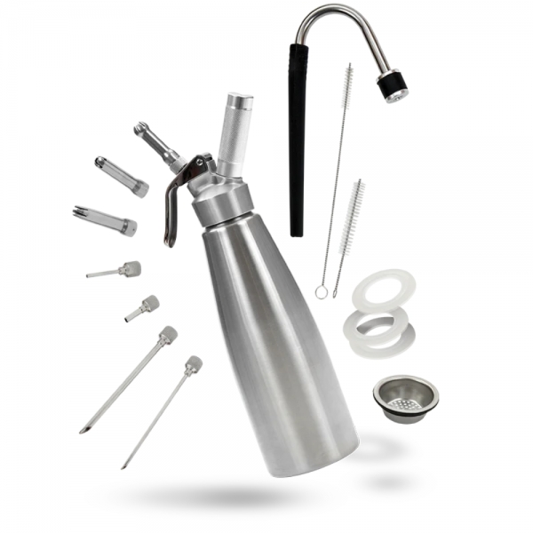 Sifone in acciaio S/S AISI 304 super accessoriato. Ideale per preparare panna montata, salse (salse calde <= 70°C), spume, guarnizioni. I componenti della testa sono completamente smontabili per una totale pulizia. Funziona con capsule di N2O 8g (non incluse).